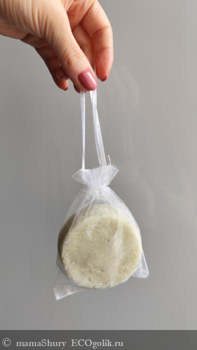 Чтобы шампунь подсох и не деформировался рекомендуется оставить его в сетчатом мешочке и повесьте сушиться. Либо сушить на проветриваемой мыльнице (я использую второй вариант).