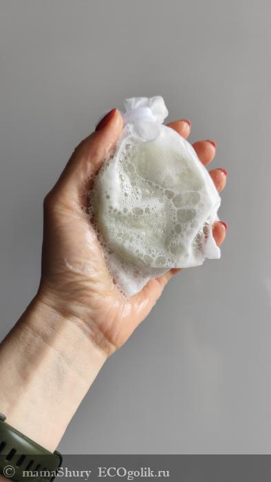 Также шампунь дополнительно помещен в сетчатый мешочек, с помощью которого его удобно использовать: и мыть, и сушить.