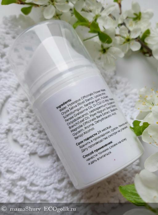 Состав: Water, Hyssopus Officinalis Flower Water, Oryza Sativa, Rice Starch, Lysolecithin, Sclerotiumgum, Xanthan Gum, Pullulan, Persea Gratissima Oil, Di-C12-13 Alkyl Malate, Octyldodecanol, Leptospermum Scoparium Branch, Leaf Oil, Piper Nigrum Seed Extract, Magnolia Officinalis Bark Extract, Bisabolol, Glycerin, Aromа, Dehydroacetic Acid, Benzyl Alcohol.