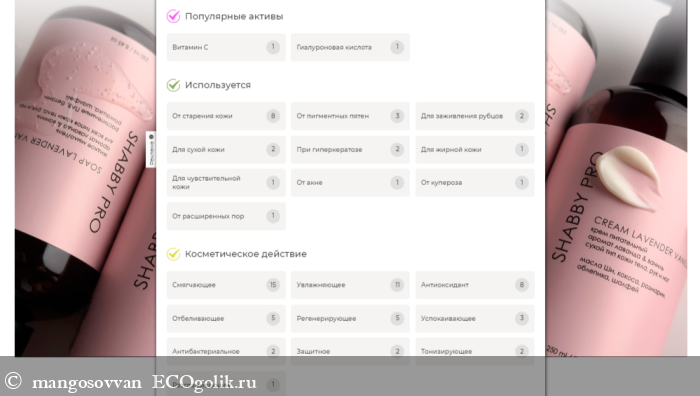 Указав назначение крема для лица раскрываются его активы, сферы применения и косметическое действие (забавно, что на фоне сейчас также представлена продукция SHABBY PRO):