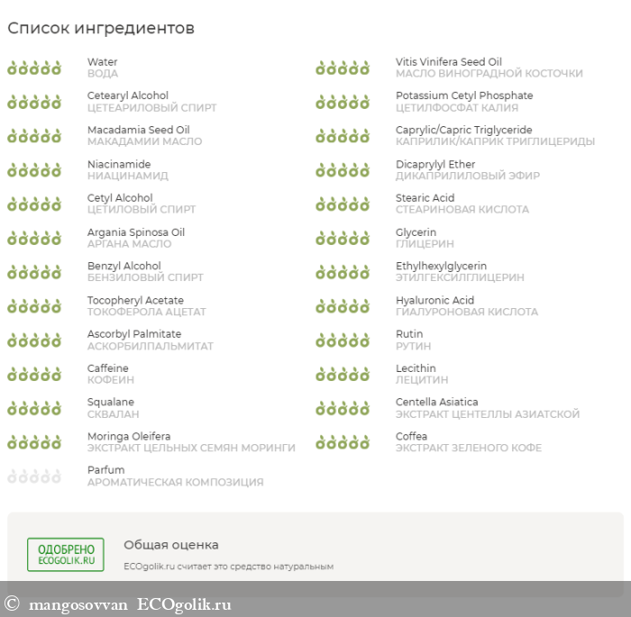 А по результатам проверки сервиса от ECOgolik.ru можно ознакомиться с подробным описанием каждого из компонентов, которые получают максимальную оценку относительно их натуральности и безопасности
