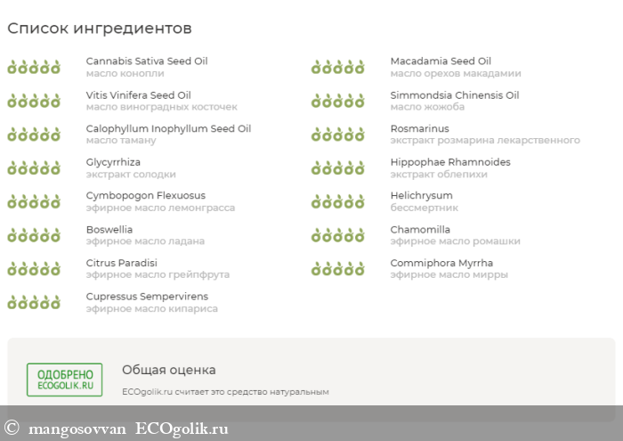 Абсолютно ВСЕ компоненты получают максимальную оценку относительно их натуральности и зелёную печать братца-кролика "ОДОБРЕНО ECOGOLIK.RU"