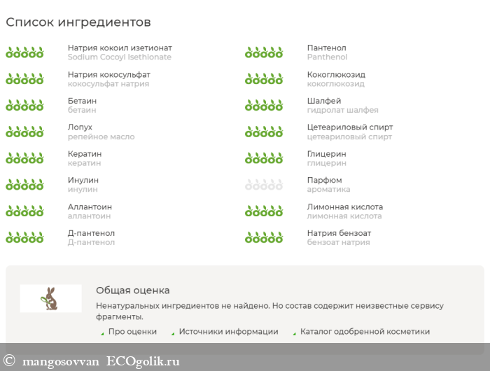 Основное описание уже раскрывает некоторые активные компоненты состава, а для более детального анализа на помощь спешит сервис проверки от Экоголика: