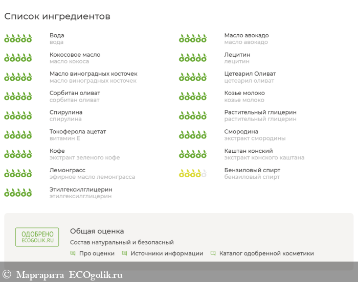 Много активных ингредиентов. Не только козье молоко, но и спирулина, зеленый кофе и другие.