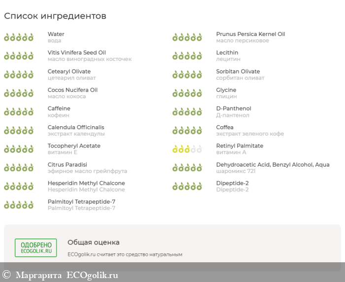 Состав я проверила при помощи сервиса Экоголик. Пептидный комплекс Eyeliss я проверяла по его отдельным ингредиентам. Итог можно увидеть на скрине. Состав – целиком одобрен. Главная роль здесь принадлежит дипептиду и липопептиду, которые не только разглаживают морщины, но и улучшают состояние капилляров, а также успокаивают, улучшают защитный барьер. Еще успокаивающим действием обладает календула. Сильный антиоксидант – зеленый кофе – направлен на лифтинг и поддержание молодости кожи. Консервант тут натуральный, одобренный – это шаромикс 721.
