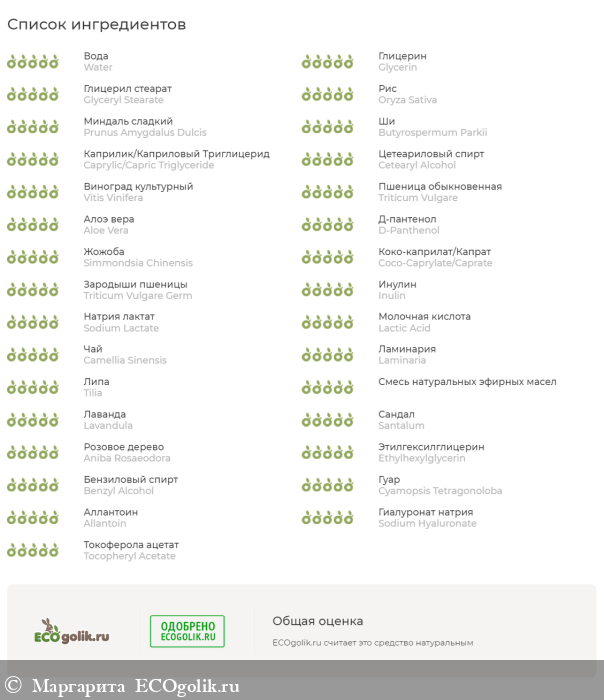 Состав крема для рук безупречен. В нем много масел – жожоба, рисовых отрубей, миндаля, ши, виноградной косточки и другие. В составе есть низкомолекулярная гиалуроновая кислота для тщательного и глубокого увлажнения кожи. Добавлены эфирные масла и витамины. Присутствуют успокаивающие экстракты – водорослей, зеленого чая, липы. Короче говоря, состав замечательный и одобренный.
