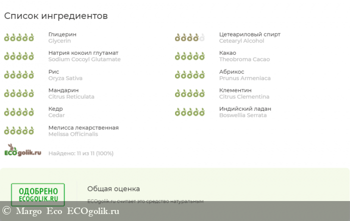 Состав"Sucrose, Glycerin, Cetearyl Alcohol, Sodium Cocoyl Glutamate, Theobroma Cacao Seed Butter, Oryza Sativa Bran Oil, Prunus Armeniaca Kernel Oil, Citrus Reticulata Leaf Oil, Citrus Paradisi Seed Oil, Citrus Clementina Peel Oil, Cedrus Deodara Seed Oil, Boswellia Serrata Oil, Rosmarinus Officinalis Flower Oil, Citrus Aurantium Leaf Oil, Melissa Officinalis Leaf Oil, Limonene* *компоненты натуральных эфирных масел"
