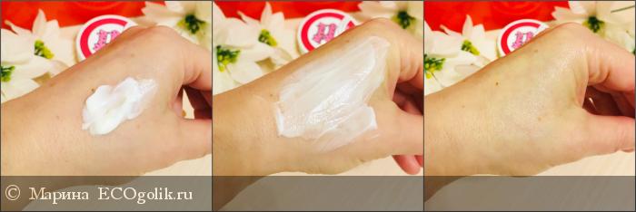 Кожа не перегружается кремом, не смотря на то, что в составе большое количество масел. Крем отлично смягчает и успокаивает кожу, уменьшает раздражение и красноту. Впитывается весь полностью, поэтому излишки салфеткой промакивать не приходится.