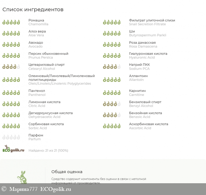 Состав: водный раствор гидролата ромашки, муцин улитки, гель алоэ вера, масло ши, масло авокадо, экстракты розы и персика, гиалуроновая кислота, цетеариловый спирт, натрия пирролидонкарбонат, полиглицериды жирных кислот, аллантоин, пантенол, L-карнитин, лимонная кислота, бензиловый спирт, дегидроуксусная кислота, бензойная кислота, сорбиновая кислота, витамин С, парфюмерная композиция.
