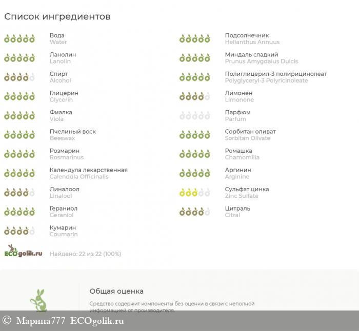 Состав 100% натуральный, давайте посмотрим, какие ингредиенты входят в него: Water (Aqua), Helianthus Annuus (Sunflower) Seed Oil, Lanolin, Prunus Amygdalus Dulcis Oil, Beeswax (Cera Alba), Alcohol, Polyglyceryl-3 Polyricinoleate, Glycerin, Limonene, Viola Tricolor Extract, Fragrance (Parfum), Hydrolyzed Beeswax, Sorbitan Olivate, Rosmarinus Officinalis (Rosemary) Leaf Extract, Chamomilla Recutita (Matricaria) Extract, Calendula Officinalis Flower Extract, Arginine, Linalool, Zinc Sulfate, Geraniol, Citral, Coumarin. Вот расшифровка состава https://ecogolik.ru/sostav_kosmetika/result/170827...