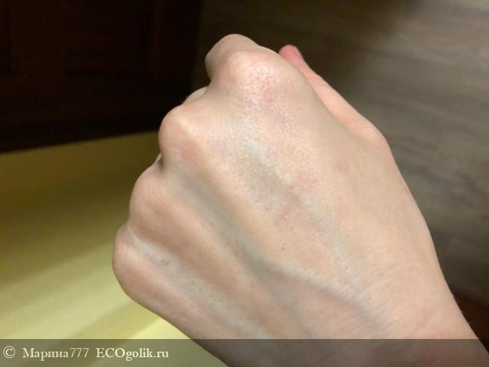 После нанесения есть ощущение что увлажнения не хватает, хочется на лицо нанести что-то еще, причем если потрогать лицо руками, то отчетливо ощущается жирное присутствие крема и становится понятно, что наносить дальше некуда. Вот даже на фото на руке видны переливания крема и его неспособность нормально впитываться.