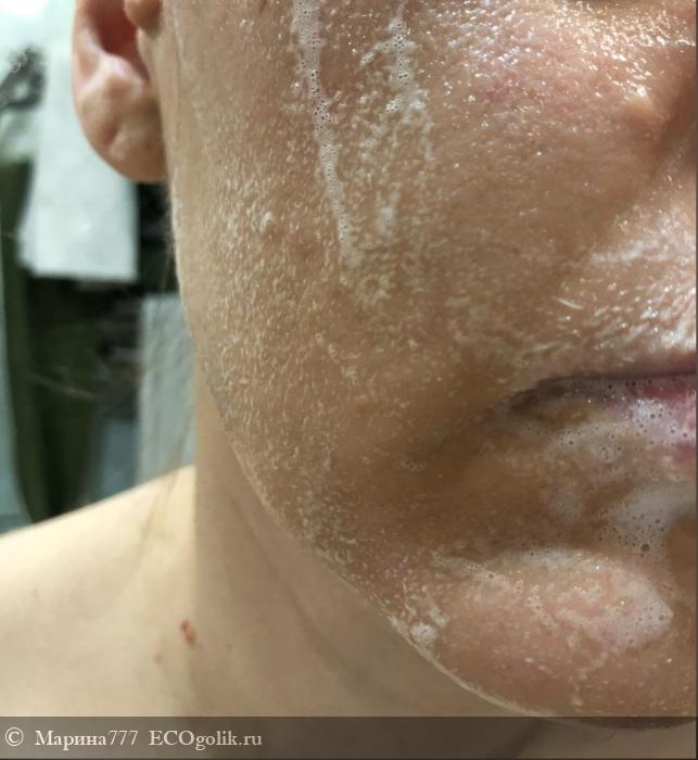 Очень порадовало использовать эту нежность именно по утрам! Наношу на влажное лицо, массирую. Лицо не стягивает, не щиплет, довольно комфортно ее использовать.