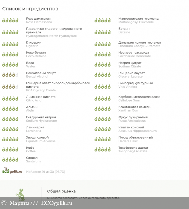 На оборотной стороне находится вся основная информация о средстве, в том числе и состав: Aqua, Rosa Damascena Flower Water, Maltooligosyl Glucoside (and) Hydrogenated Starch Hydrolysate, Natural Betaine, Glycerin, Disodium Cocoyl Glutamate*, Coco Betaine*, Saccharide Isomerate (and) Aqua (and) Citric Acid (and) Sodium Citrate*, Benzyl Alcohol (and) Glyceryl Laurate*, PCA Glyceryl Oleate*, Vitis Vinifera (Grape) Fruit Juice Powder (сок винограда), Citric Acid, Cellulose Gum (and) Algin*, Xantan Gum, Sodium Hyaluronate, Fucus Vesiculosus (фукуса) Extract, Laminaria Japonica Aresh (ламинарии) Extract, Aesculus Hippocastanum (конского каштана) Extract, Equisetum Arvense (хвоща) Extract, Hedera Helix (плюща) Extract, Coffea Arabica (кофе) Extract, Tocopheryl Acetate (Витамин Е), Rosa Affinis Rubiginosa Oil (эфирное масло розы), Santalum Album Oil (эфирное масло сандала).