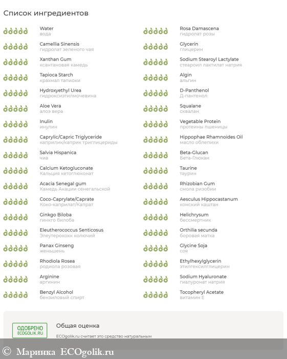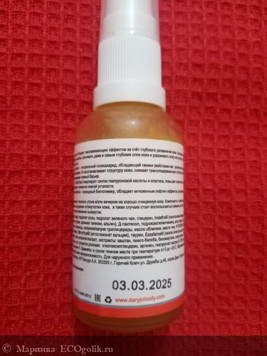 Сыворотка мне понравилась своим натуральным составом. На скрине состава видно, как много полезного в этом продукте. А гиалуроновая кислота использована низкомолекулярная.