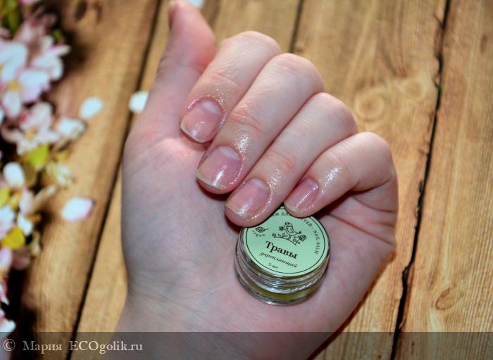 Сделала обрезной маникюр, подпилила ноготочки и сразу нанесла укрепляющий бальзам «Травы».