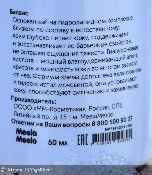 На официальном сайте MEELA MEELO делится следующей информацией: «Мы используем в косметических средствах как компоненты, подаренные природой - масла, глины, ягоды, травы, так и самые современные разработки косметической индустрии. Все используемые ингредиенты соответствуют экоголическим стандартам».
