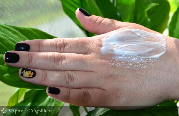 Крем белоснежного цвета с лёгким ароматом свежих духов.