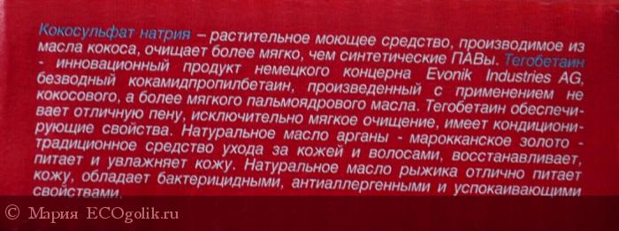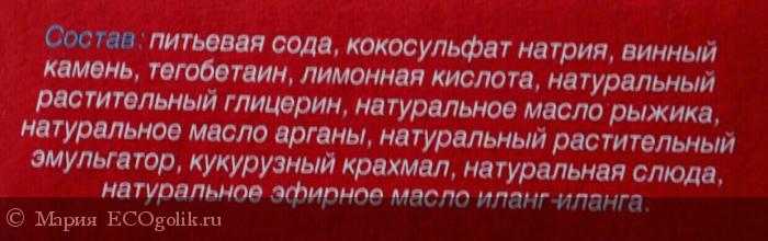 Питьевая сода, кокосульфат натрия, винный камень, тегобетаин, лимонная кислота, натуральный растительный глицерин, натуральное масло рыжика, натуральное масло арганы, натуральный растительный эмульгатор, кукурузный крахмал, натуральная слюда, натуральное