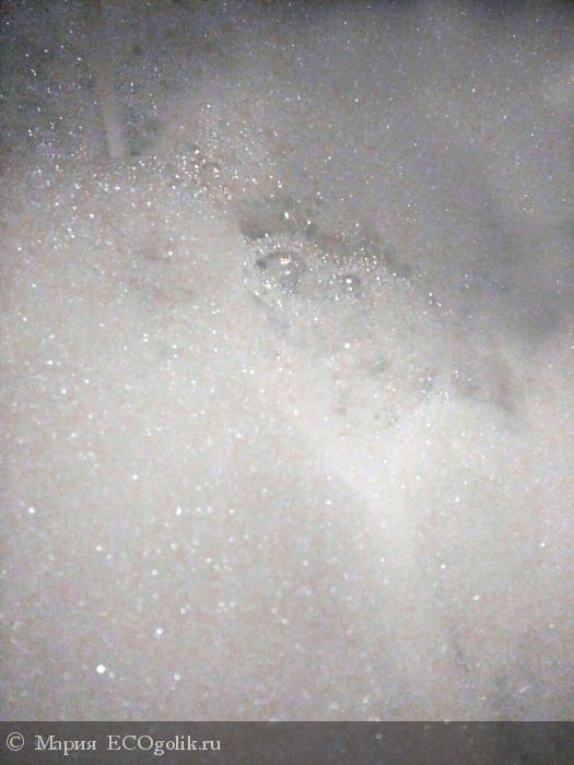Растворяла в небольшом сите, вспомнив впечатления девушки: «На дне ванной болталось несколько нерастворенных кусочков, потом они благополучно растаяли». В сите всё растворилось, когда набралась 1/3 ванны. Внизу около слива были мелкие крошки, похожие на подтаявшую морскую соль или песочек. При принятии ванны их не ощущалось
