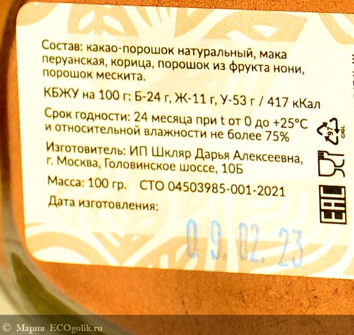 АТМАН написал об этом очень романтично: «Нам удалось гармонизировать энергичный темперамент какао-бобов, перетертых в порошок, мягким вкусом суперфудов из Южной Америки (мака перуанская или "Американский Жень Шень", порошок фрукта нони, мескита) и ароматной корицы».