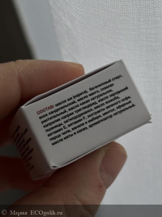 Еще один нюанс при нанесении: ощущение раздражения и холодка/жары на губах, интересное чувство. Оно обусловлено маслом мяты и ментолом в составе.