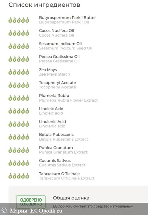 Butyrospermum Parkii (карите) Oil, Cocos Nucifera (Coconut) (кокоса) Oil, Sesamum Indicum Seed (кунжутное) Oil, Persea Gratissima (авокадо) Oil, Zea Mays Starch, Tocopheryl Acetate (витамин Е), Plumeria Rubra Flower Extract (Frangipani) (экстракт франжипани), Linoleic acid and Linolenic acid (витамин F), Betula Pubescens (коры березы) Extract, Punica Granatum (косточки граната) Extract, Cucumis Sativus (семян огурца) Extract, Taraxacum Officinale (корня одуванчика) Extract.
