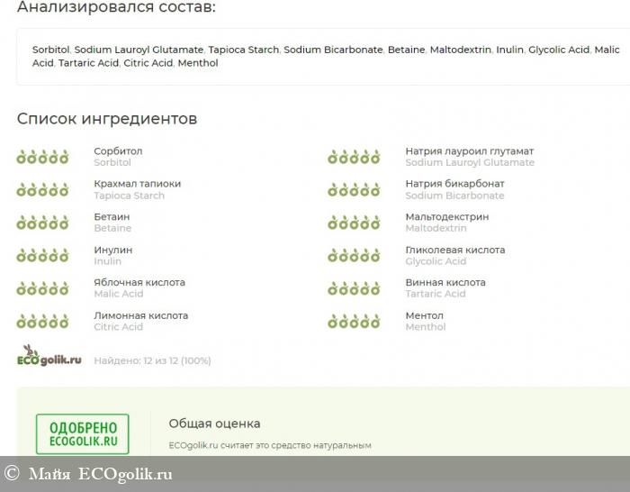 Sorbitol (сорбитол), Sodium Lauroyl Glutamate (натрия лауроил глутамат),Tapioca Starch (крахмал тапиоковый), Sodium Bicarbonate (бикарбонат натрия), Betaine (бетаин), Maltodextrin (мальтодекстрин), Inulin (инулин), Glycolic Acid (гликолевая кислота), Malic Acid (яблочная кислота), Tartaric Acid (винная кислота), Citric Acid (лимонная кислота), Menthol (ментол).