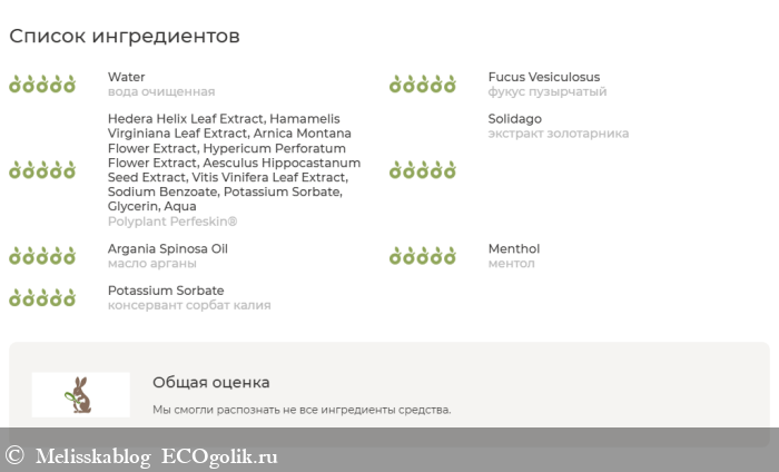 Сервис проверки Экоголик не определил лишь пару ингредиентов, но они лишь безопасные и при этом полезные экстракты.