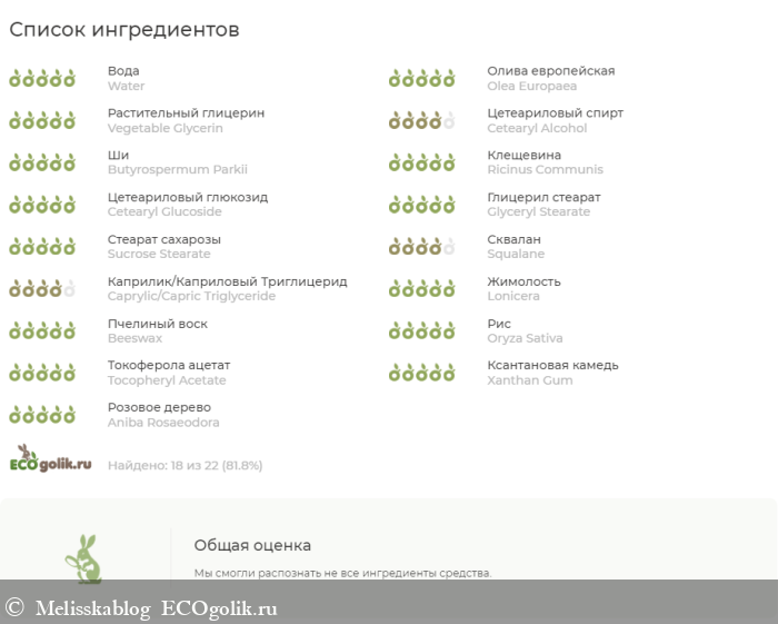 Сервис проверки Экоголик не определил несколько ключевых ингредиентов в том числе и изюминку состава. Но проблем нет, всё абсолютно натурально и безопасно.