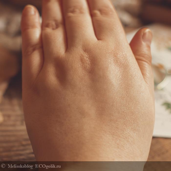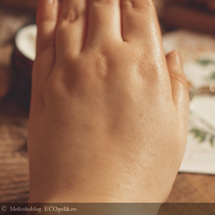 Мгновенно не впитывается и оставляет после себя лёгкий блеск на коже и небольшое чувство маслянистости на руках.