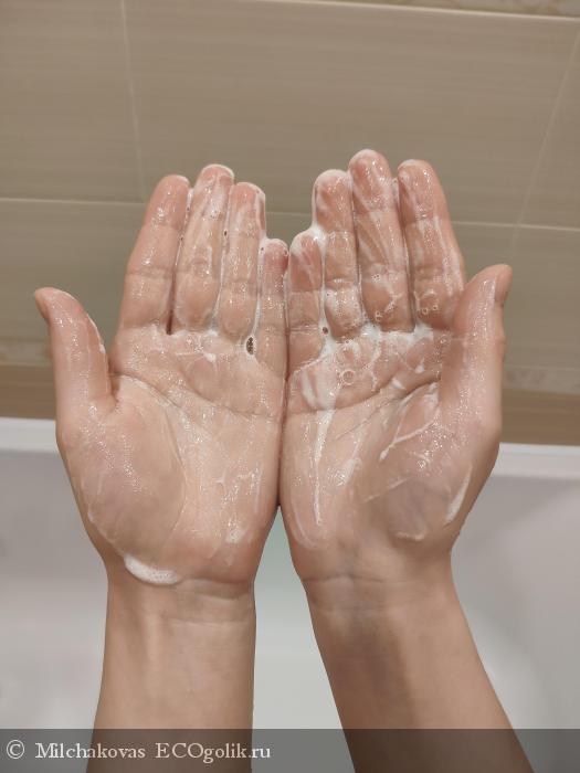 Он пенится совсем слегка, и, в отличии от гелей масс-маркета, не образует плотного покрытия, которое потом тяжело смыть.