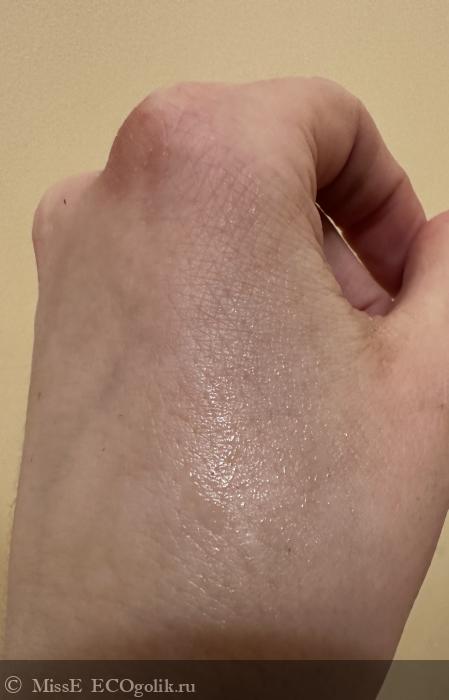 не как вода, хотя твердой не назвать. Скорее эмульсия. Впитывается и высыхает за комфортное время, долго ждать не приходится.