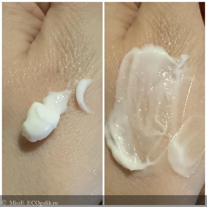 Изначально, при извлечении из тубы текстура выглядит плотной. Но при распределении ощущается достаточно легкой и влажной. Бывают такие текстуры, которые при извлечении выглядят плотными, и при распределении они жирные, масляные. Этот крем изначально для меня выглядел похожим на такой, но когда я начала его распределять, увидела, что нет, текстура не масляная, а скорее более «влажная», и такая текстура за счет видимо меньшего количества масел более легкая и быстрее впитывается, чем жирные кремчики.