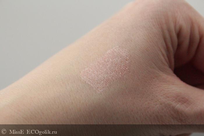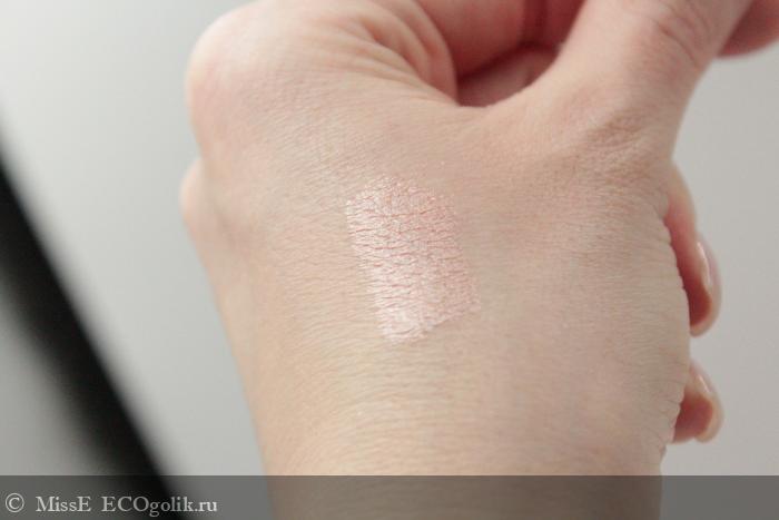 Приятнейший оттенок, который пусть и слегка теряет свою розовинку при распределении, но все же приятно сияет на коже и дарит ей достаточно аккуратный блеск, хоть и достаточно заметный.