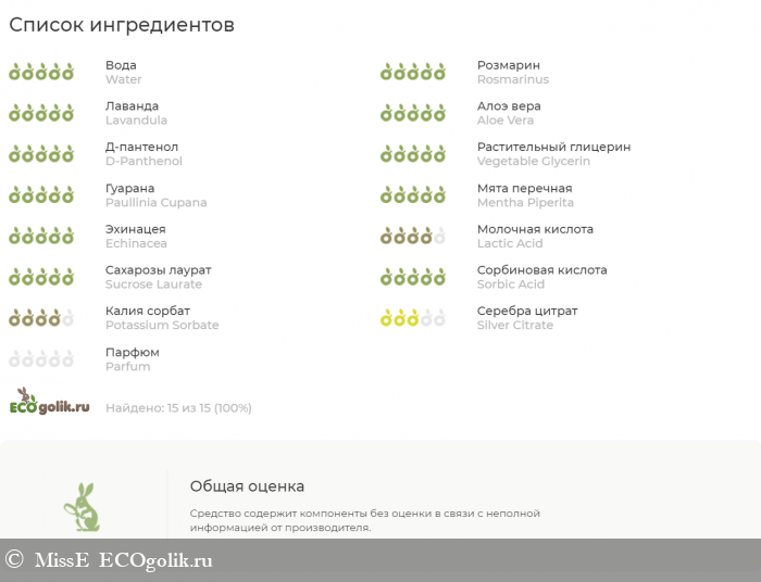 Деионизированная вода, цветочная вода розмарина и лаванды, гель алоэ-вера, д-пантенол, растительный глицерин, экстракт гуараны, экстракт мяты, экстракт эхинацеи, молочная кислота, лаурат сахарозы, сорбиновая кислота, сорбат калия, цитрат серебра, ароматическая композиция.