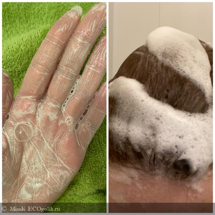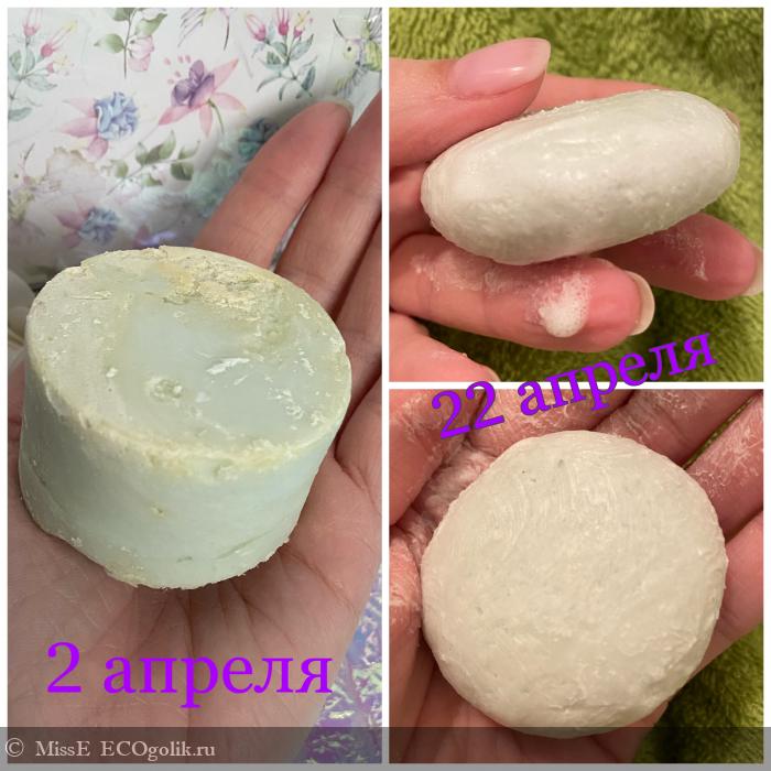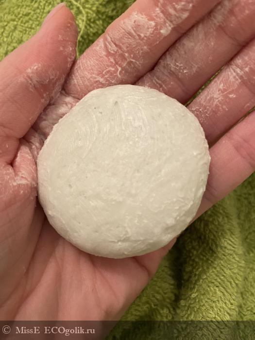 Изначально, мы имеем достаточно твёрдый брусок шампуня, который при соприкосновении с водой становится пеной, которой в свою очередь я и мою голову. Пенится шампунь легко, я стараюсь не намыливать им непосредственно волосы, а все же руками и водой делаю пенку и переношу на волосы.