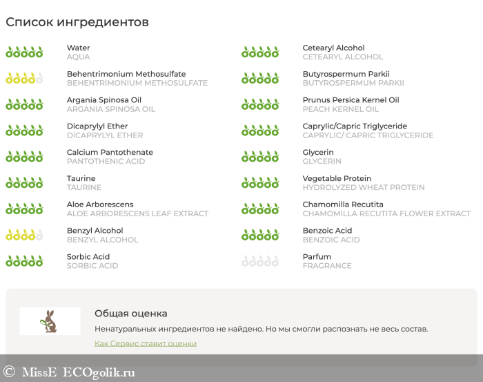 Состав: AQUA, CETEARYL ALCOHOL, BEHENTRIMONIUM METHOSULFATE, BUTYROSPERMUM PARKII (SHEA BUTTER), ARGANIA SPINOSA OIL, PEACH KERNEL OIL, DICAPRYLYL ETHER, CAPRYLIC/ CAPRIC TRIGLYCERIDE, PANTOTHENIC ACID, GLYCERIN, TAURINE, TOCOPHERYL АCETATE, HYDROLYZED WHEAT PROTEIN, ALOE ARBORESCENS LEAF EXTRACT, CHAMOMILLA RECUTITA (MATRICARIA) FLOWER EXTRACT, BENZYL ALCOHOL, BENZOIC ACID, SORBIC ACID, FRAGRANCE
