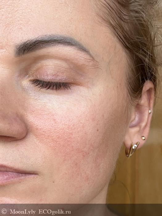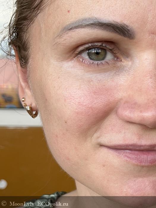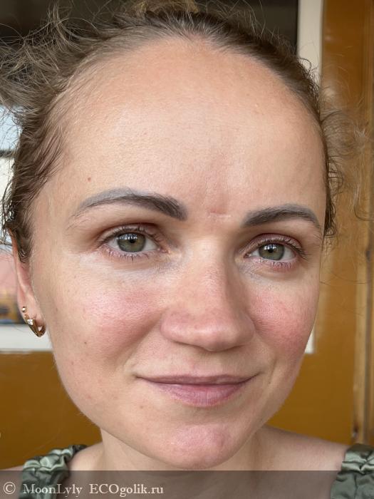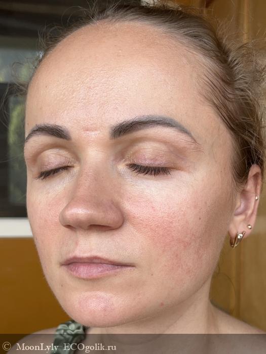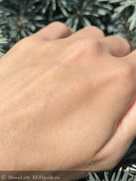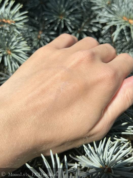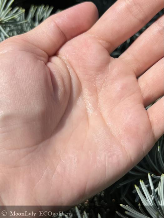 Аккуратно распределяю продукт пальцами по коже. На ощупь он как бы более вязкий, чем простой гидролат, скользит под пальцами, впитывается не сразу. Спустя пару минут тоник полностью поглощается поверхностью кожи без следа, не оставляет ни липкой, ни жирной плёночки.