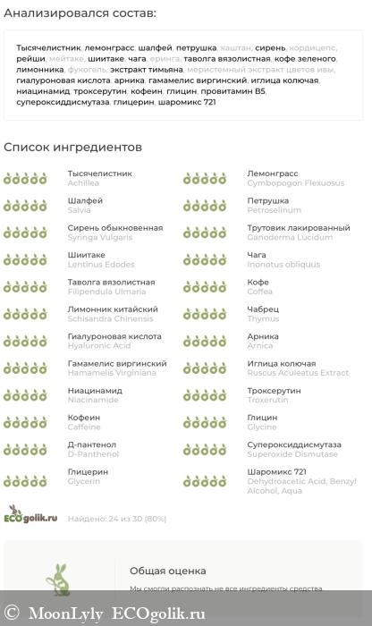 Состав: купаж структурированных гидролатов тысячелистника, лемонграсса, шалфея, петрушки; экстракт цветов каштана и сирени, экстракт грибов кордицепса, рейши, мейтаке, шиитаке, чаги, еринги; экстракты таволги вязолистной, кофе зеленого, лимонника; фукогель, экстракт тимьяна, меристемный экстракт цветов ивы, гиалуроновая кислота, экстракты арники горной, гамамелиса виргинского, иглицы колючей, ниацинамид, троксерутин, кофеин, глицин, провитамин В5, супероксиддисмутаза, глицерин, шаромикс 721.