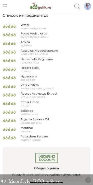СОСТАВ: вода очищенная, фукус пузырчатый, Polyplant Perfeskin® (комплекс экстрактов арники, конского каштана, гамамелиса, плюща, зверобоя, виноградной лозы), Legactif® (комплекс экстрактов иглицы понтийской, коры лимона, золотарника), масло арганы, ментол, консервант сорбат калия.