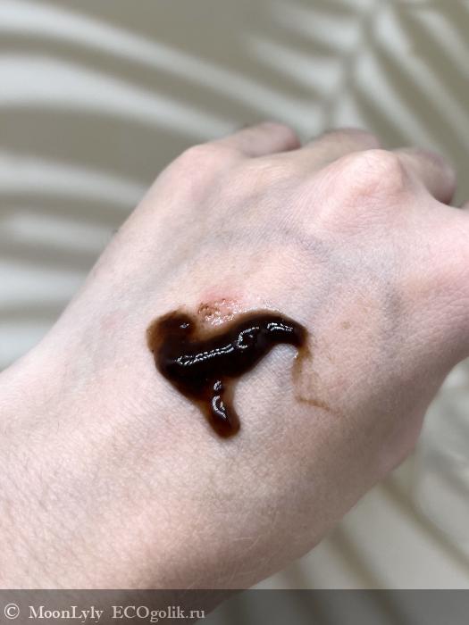 А дальше начинаются необычности. Вроде я столько подобных средств перепробовала, а оказывается производителям ещё есть, чем нас удивить. Начиная с цвета - гель практически чёрного цвета, или тёмно-бурый с коричневатым оттенком. Тут сразу поверишь составу, ведь в нём преобладает фукус пупырчатый собственной персоной