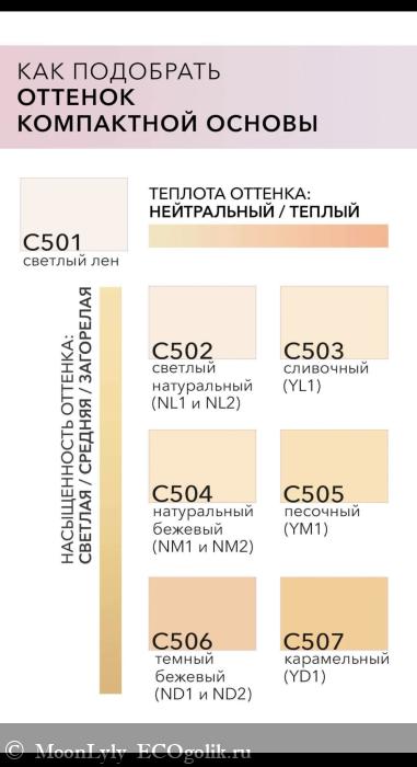 Выполнив все рекомендации, я выбрала для себя оттенок С506 темный бежевый (ND1 и ND2). Брала с таким расчётом, что буду пользоваться основой летом осенью на загорелой коже. Однако оттенок не настолько тёмный, как я предполагала, поэтому смогу им пользоваться даже когда загар потускнеет.