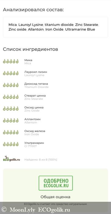 INCI: слюда, обработанная лауроил лизином (Mica CI 77019 treated with Lauroyl Lysine), диоксид титана (titanium dioxide CI 77891), стеарат цинка (Zinc Stearate), оксид цинка (ZINC OXIDE CI 77947), аллантоин (Allantoin), +- оксиды железа (Iron Oxide CI 77491, CI 77492), ультрамарины (Ultramarine Blue CI 77007).
