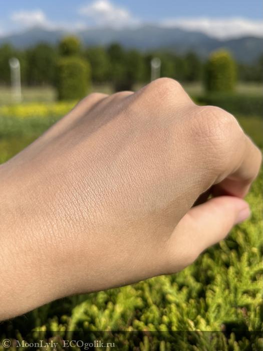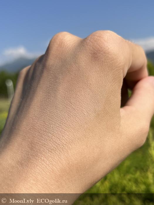 Сначала покажу свотчи на руке. Понятно, что оттенок пудры светлее загорелых рук, но зато на снимках хорошо передана текстура продукта.