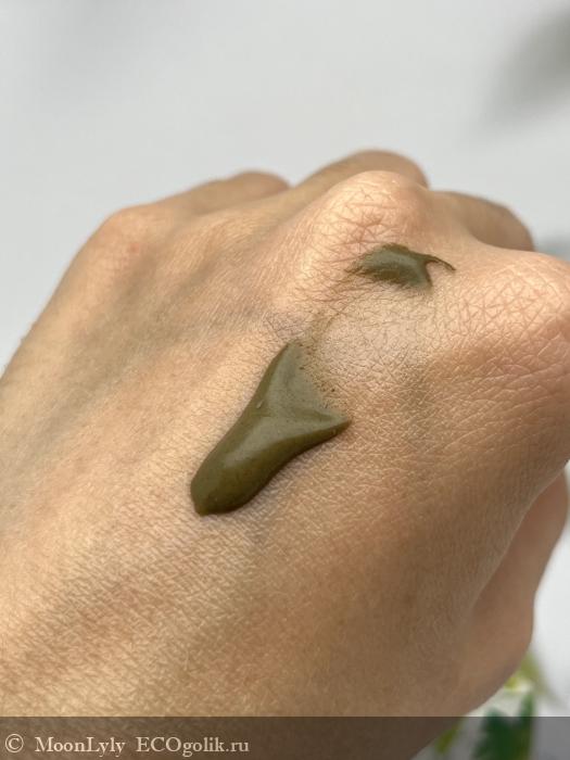 Плотная, тёмно-зелёного болотного цвета кремовая маска содержит большое количество каолина. У неё густая однородная консистенция.