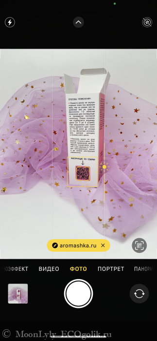 В картонной коробочке находится пузырёк с продуктом. С недавних пор в Аромашке отказались от бумажных инструкций, поэтому всю необходимую информацию можно получить, перейдя по ссылке из QR-кода.