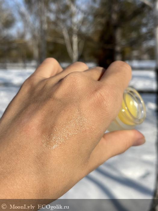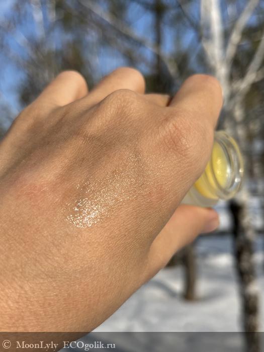 Теперь попробую описать консистенцию. Она очень необычная и ничего похожего у меня раньше не было. Бальзам тактильно как однородный густой маслянистый гель. При этом он податливый и спокойно извлекается из ёмкости. На кожу ложится плотным слоем средней толщины.