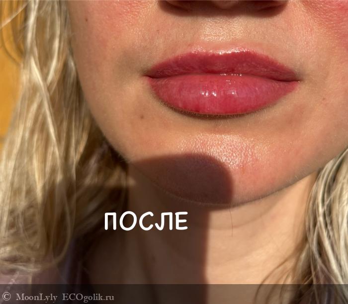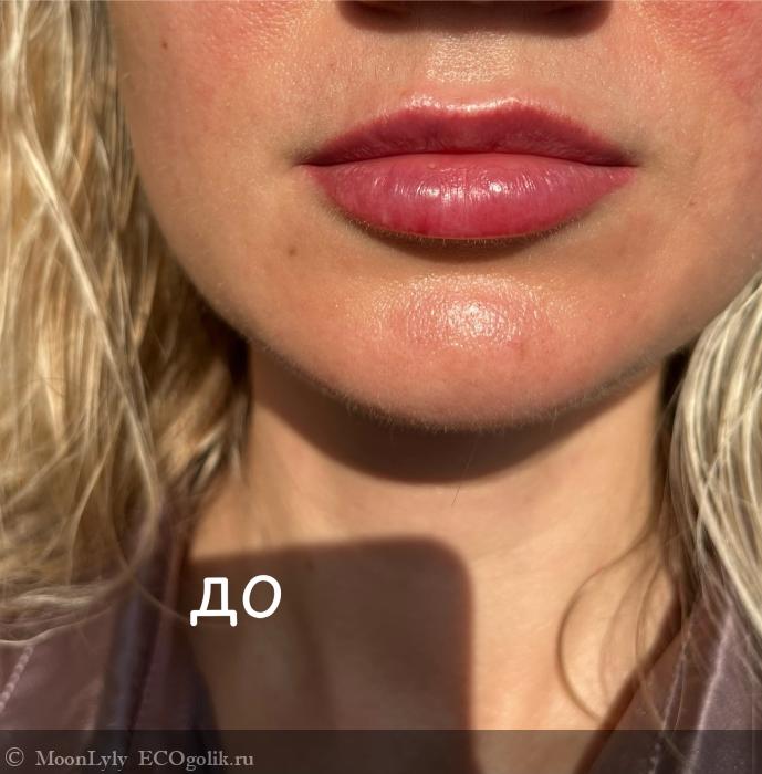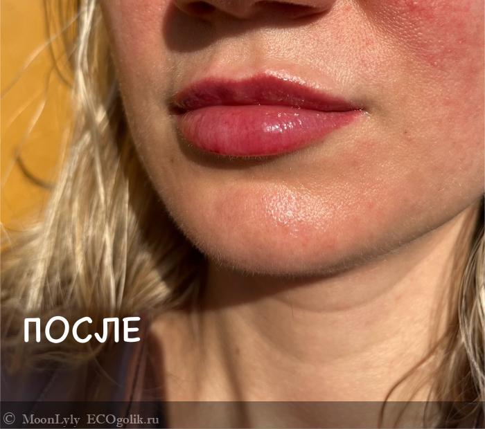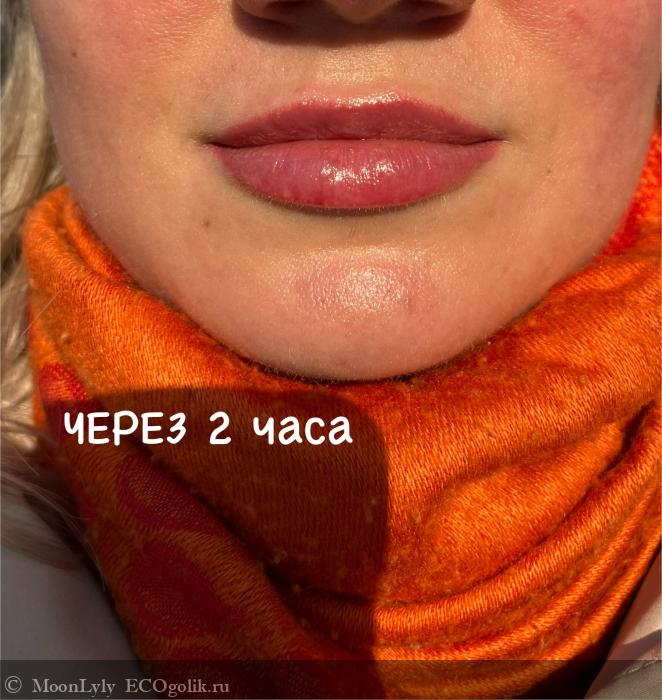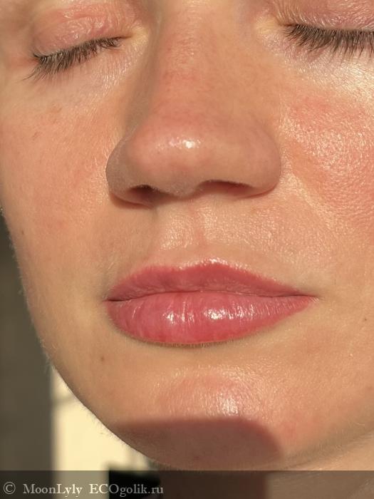 При чём от тепла кожи продукт не растекается да контур. Он локально держится в месте нанесения благодаря ланолину в составе. Губы выглядят сочно. Они гладкие, мягкие, будто наполненные влагой.