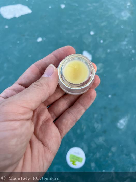 Бальзам находится в милой круглой баночке из матового стекла. Она приятная на ощупь, словно бархатная. Крышка завинчивается по резьбе. Объём 5 мл.