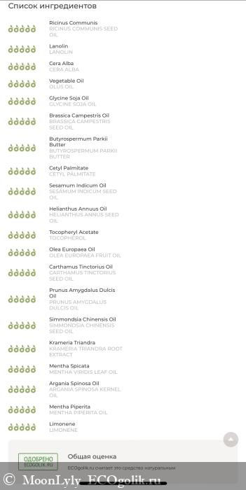 масло клещевины*, ланолин, пчелиный воск*, растительные триглицериды*, масло соевых бобов*, рапсовое масло**, масло ши*, цетил пальмитат, кунжутное масло*, масло подсолнечника*, витамин E, оливковое масло**, сафлоровое масло*, миндальное масло*, масло жожоба*, экстракт корня ратании, эфирное масло мяты кудрявой, масло арганы*, эфирное масло мяты перечной*, лимонен.